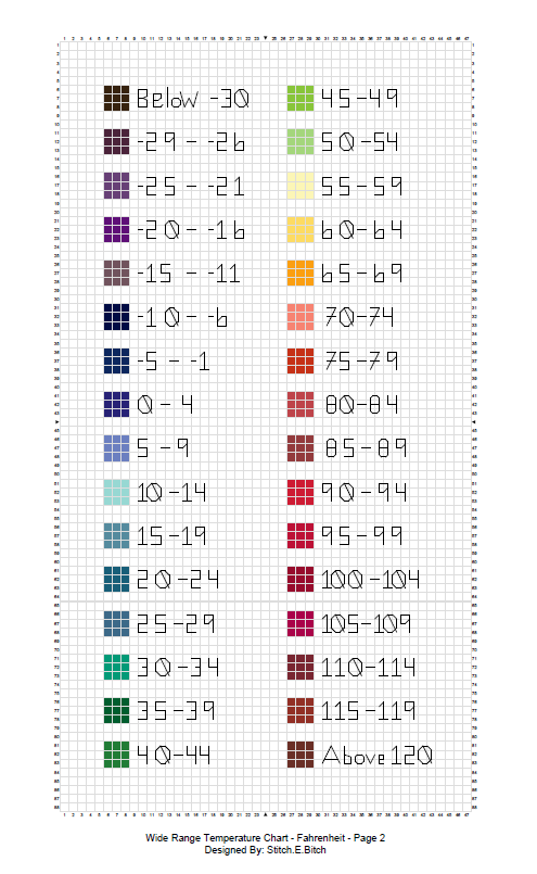 This is a wide range temperature color chart in Fahrenheit. Feel free to use this on your preferred temperature SAL chart! If you do use these colors please credit Stitch.E.Bitch (or Stitch.E.Btch) as the original designer. Thank you!